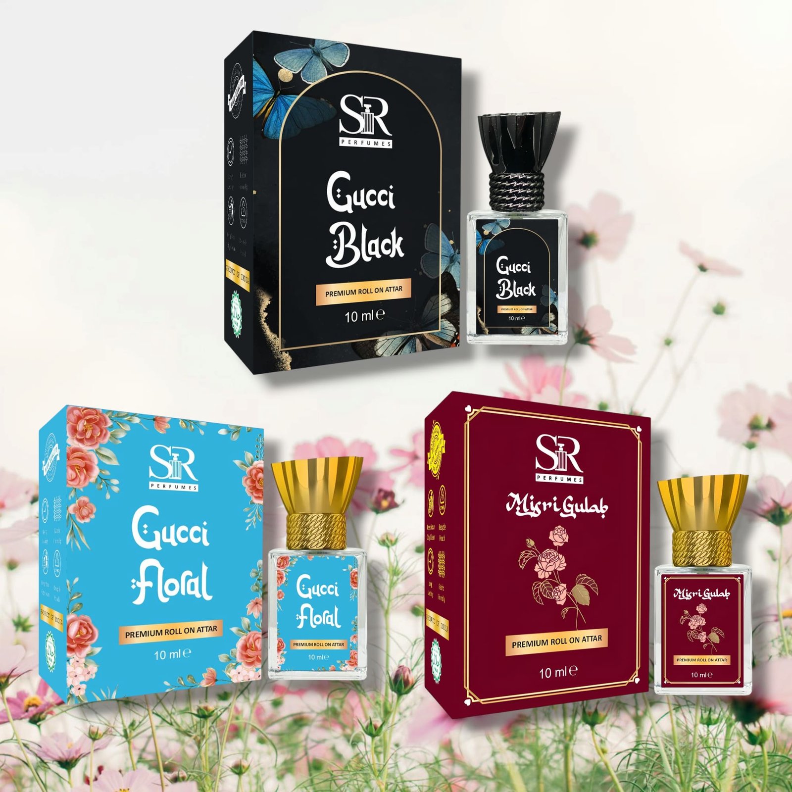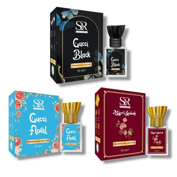 3 Pcs Attar Perfume Set Gucci Floral & Gucci Black & Misri Gulab 10 ml Each